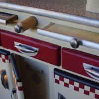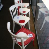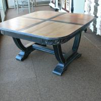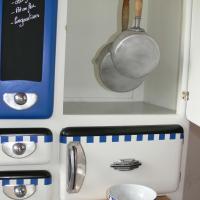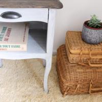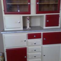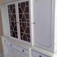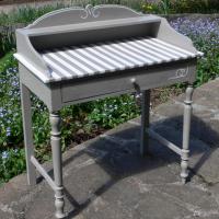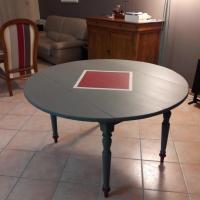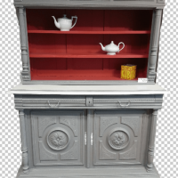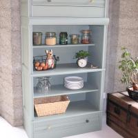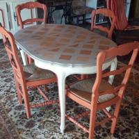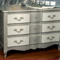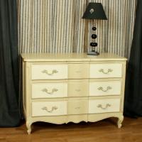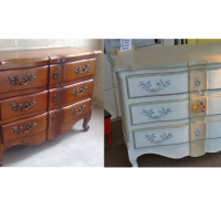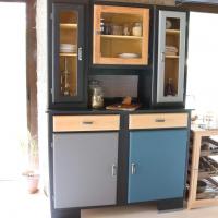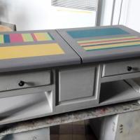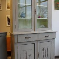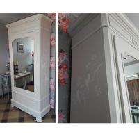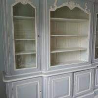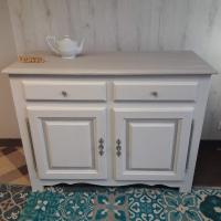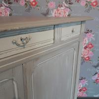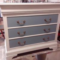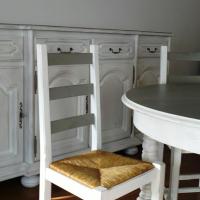 La première étape est souvent un décapage par aérogommage afin de débarrasser le bois de ces précédents traitements. Puis nous appliquons une couche d'apprêt, deux couches de peinture à minima, éventuellement une patine blanche ou un effet vieilli. Le meuble peut être protégé par un vernis mat transparent lessivable ou une cire.